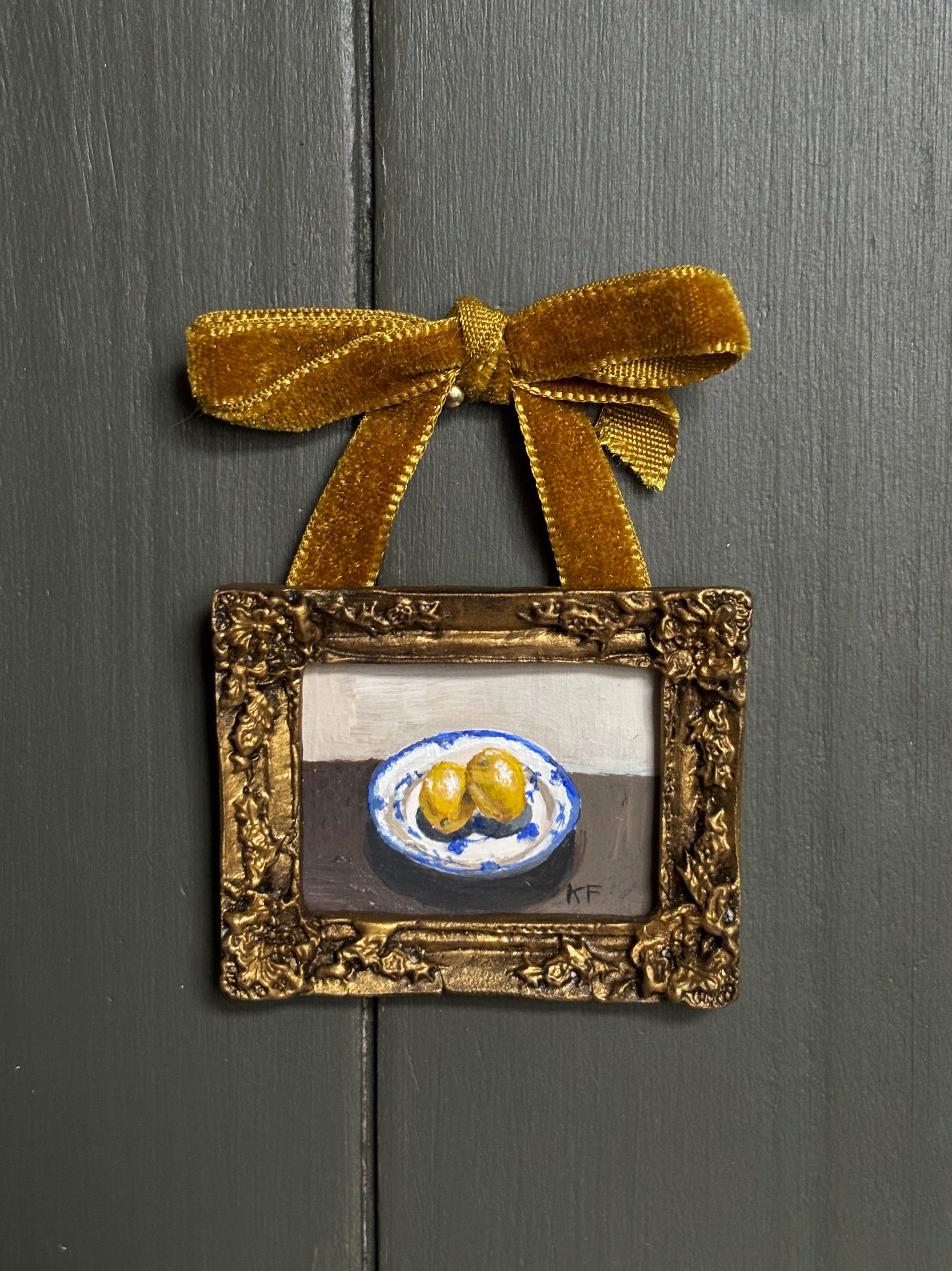 Still Life with Lemons2024Acrylic on Yupo PaperPainted clay frame, velvet ribbon hanger1.75 x 2.25”SOLD